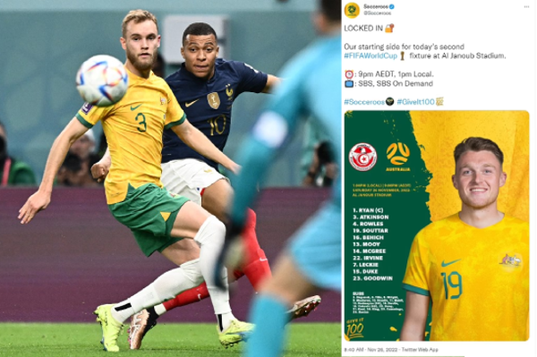 澳洲首輪分組賽以1:4不敵衛冕的法國,今仗面對突尼西亞若是落敗,就要準備「執包袱」回家。背水一戰的澳洲,賽前還鬧笑話,官方社交媒體團隊於Twitter公佈正選陣容名單時,誤把上仗受傷未能上陣的右閘艾堅遜(Nathaniel Atkinson)放在陣內。