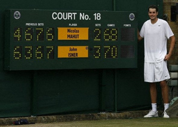 說的是2010年溫布頓公開賽首圈,美國「長人」伊斯拿(John Isner)與法國的馬赫特(Nicolas Mahut)打得難分難解,當伊斯拿與對手戰至6:4、3:6、6:7及7:6(7/3),盤數打成2:2,戲肉在決勝盤出現,兩人竟合演70:68的局數,單是這一盤就打了8小時11分鐘,而全場比賽需要分三日作賽,共耗時11小時5分鐘,當然是世界紀錄!